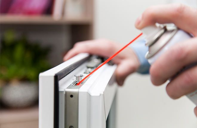Нанесите глубокопроникающее смазочное средство на петли, замки и подвижные элементы створок, чтобы обеспечить плавность открывания‑закрывания.