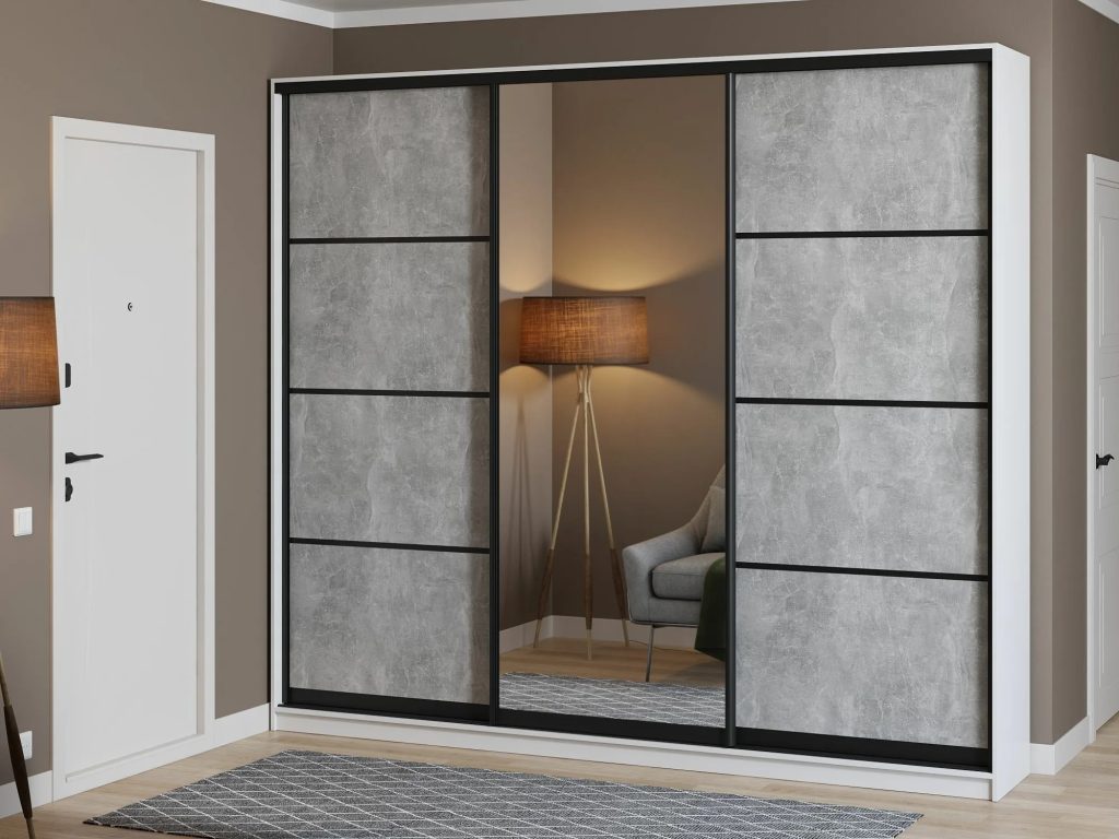 - Лофт, бетон, серые стены, чёрные ручки и профили — здесь графит выглядит логично. Встроенный шкаф-купе с графитовым зеркалом и чёрным разделителем часто становится ключевым акцентом в комнате.